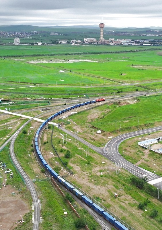7月24日,一列滿載貨物的中歐班列從中國(guó)鐵路哈爾濱局集團(tuán)有限公司滿洲里站駛出國(guó)門(mén)(無(wú)人機(jī)照片)。