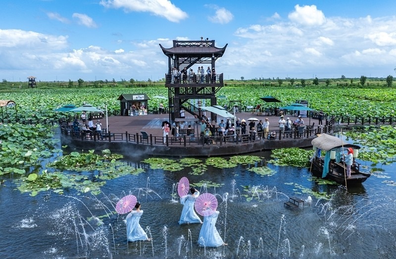 7月26日,游客在江蘇省興化市萬畝荷塘景區(qū)觀看表演(無人機(jī)照片)。