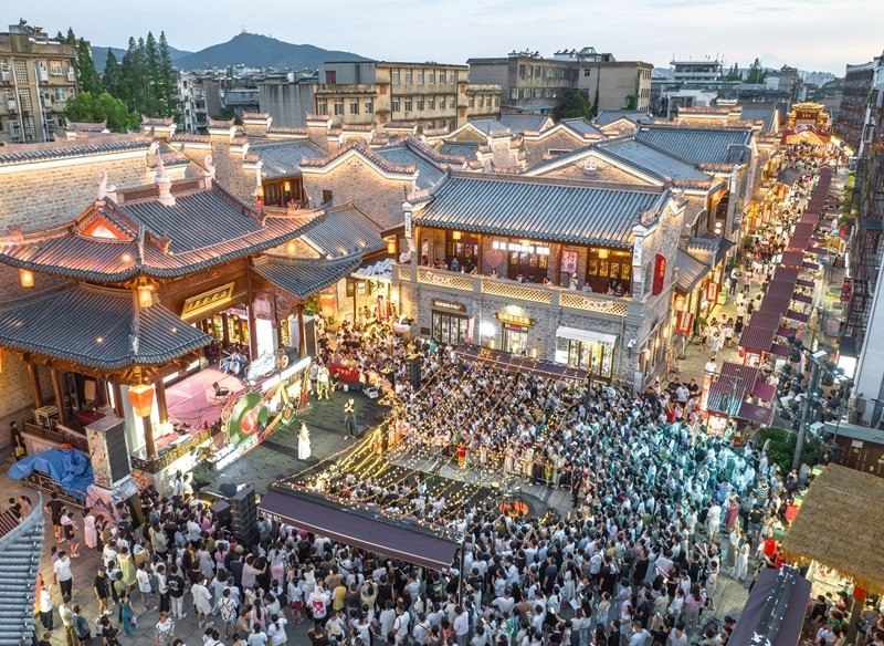 7月25日,游客在湖北省襄陽古城管家巷文化休閑街區(qū)觀看星光音樂會(huì)(無人機(jī)照片)。
