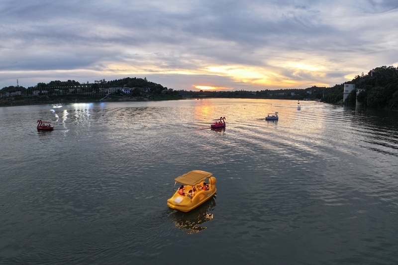 7月25日,人們在四川省廣安市武勝縣嘉陵江畔龍女湖泛舟游玩。