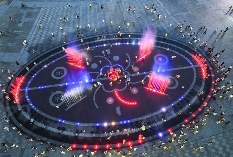 7月24日,市民和游客在河南省濟(jì)源市世紀(jì)廣場賞噴泉納清涼(無人機(jī)照片)。