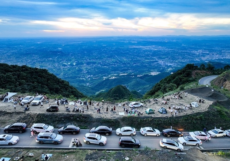 7月25日,四川省華鎣市市民駕車來到華鎣山21道拐避暑納涼(無人機(jī)照片)。