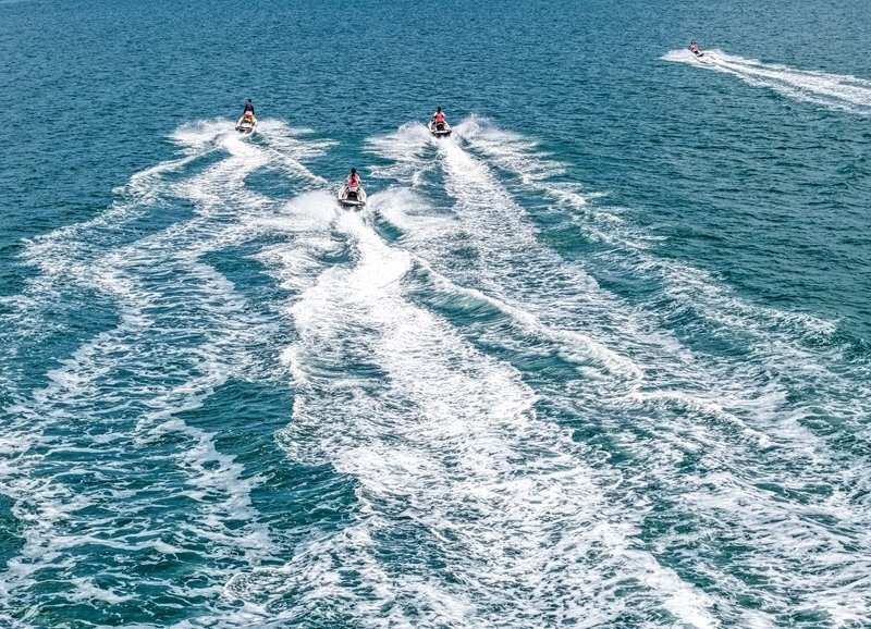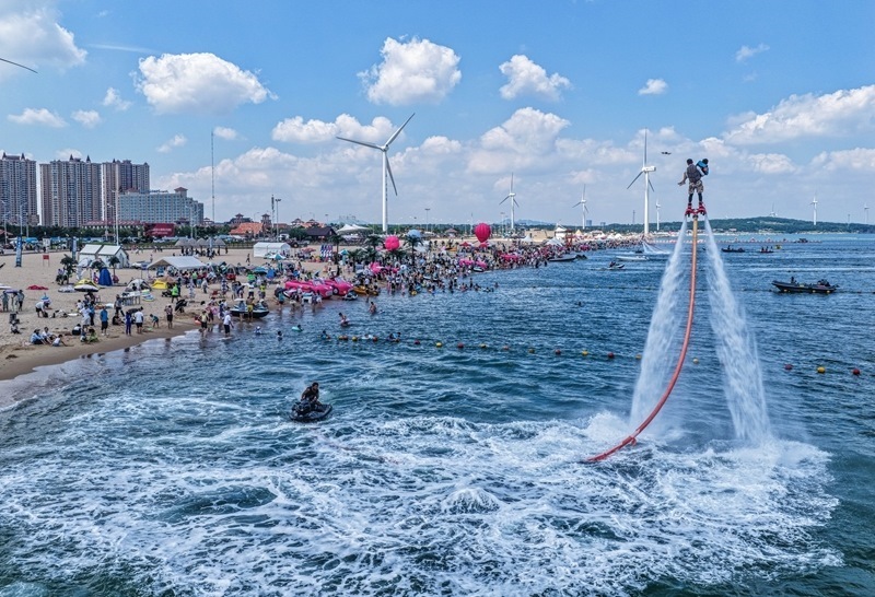 7月24日,游客在山東省榮成市那香海國際旅游度假區(qū)體驗(yàn)“水上飛人”(無人機(jī)照片)。