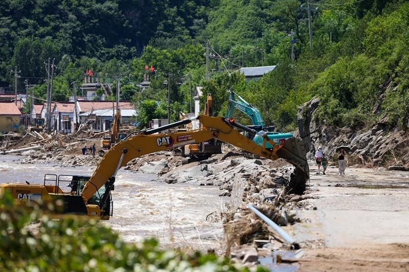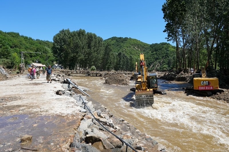 7月30日,在北京市密云區(qū)馮家峪鎮(zhèn),道路搶修人員恢復被洪水沖斷的道路。