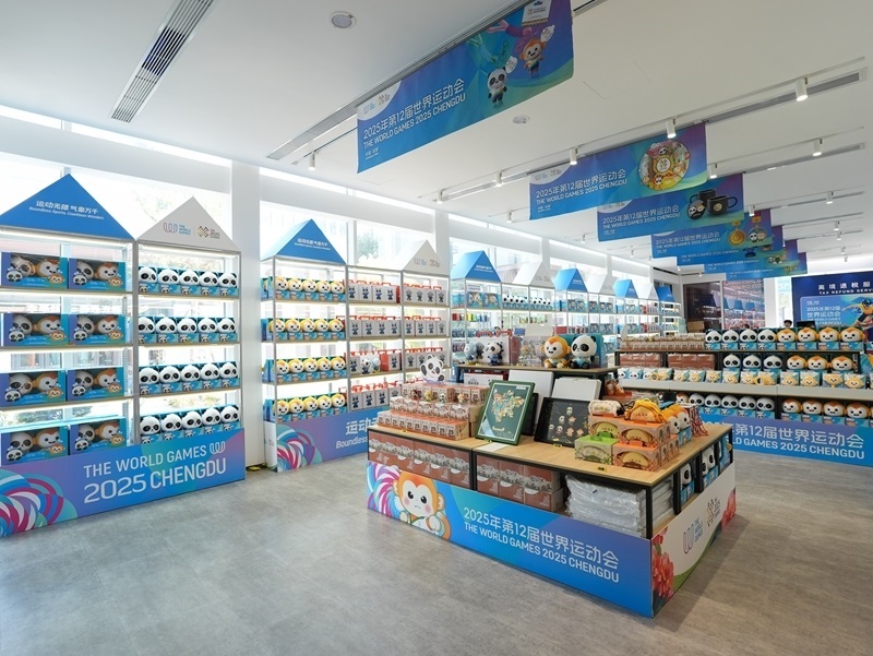 這是8月3日在成都世運(yùn)會運(yùn)動(dòng)員村A區(qū)拍攝的官方特許商品零售店內(nèi)的紀(jì)念品。