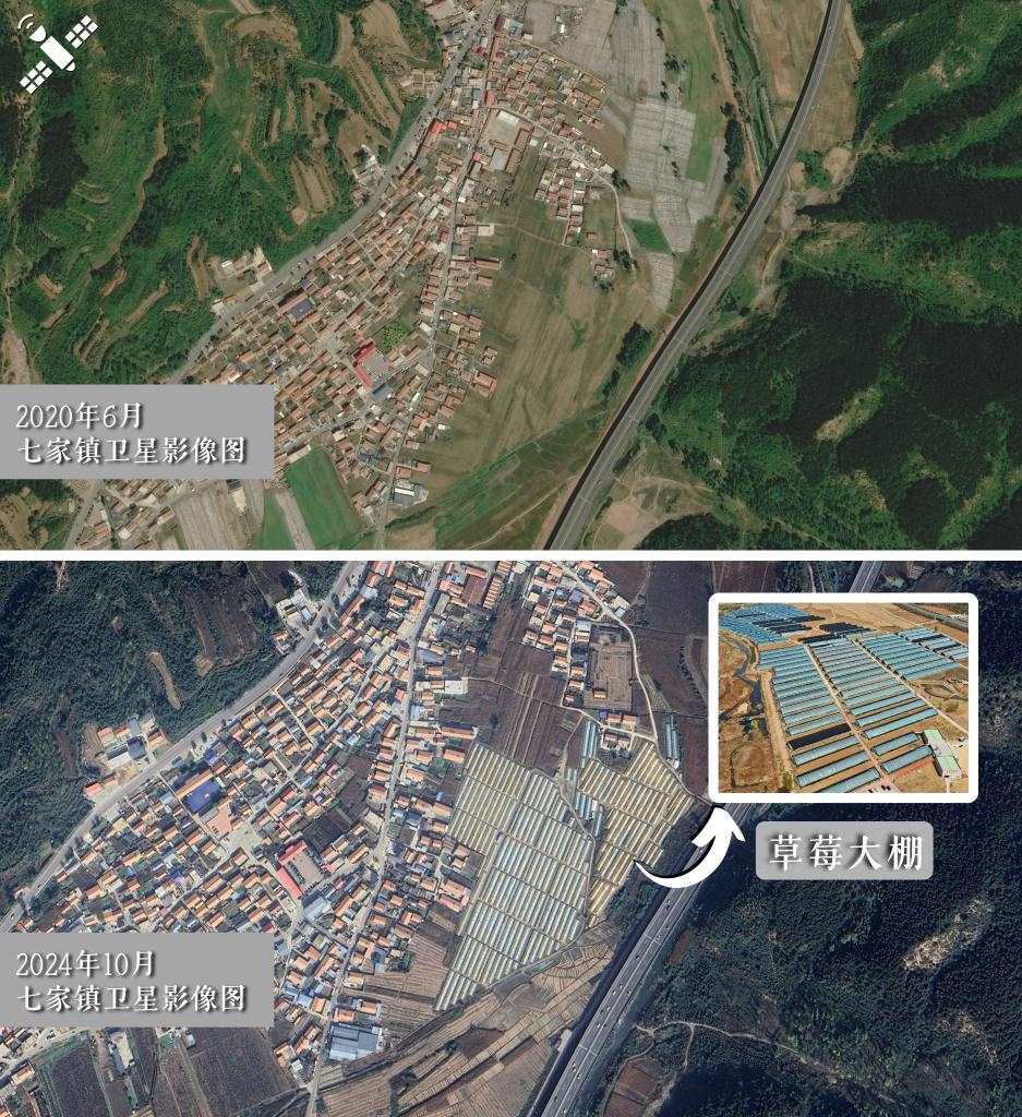 解讀:對比2020年6月(上圖),2024年10月七家鎮(zhèn)連片溫室草莓大棚衛(wèi)星圖中的反光區(qū)域顯著增加(下圖)。