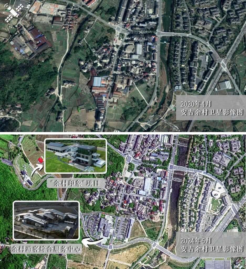解讀:2020年4月原貌(上圖)對比2024年6月新貌(下圖),安吉余村將廢棄廠房改造為“余村印象”項目,并建成余村游客綜合服務(wù)中心。