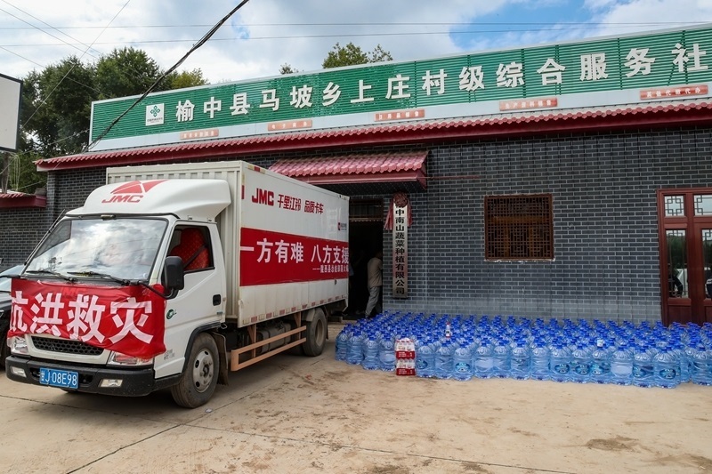 8月10日,一輛載著救援物資的車輛??吭谟苤锌h馬坡鄉(xiāng)上莊村臨時(shí)安置點(diǎn)。
