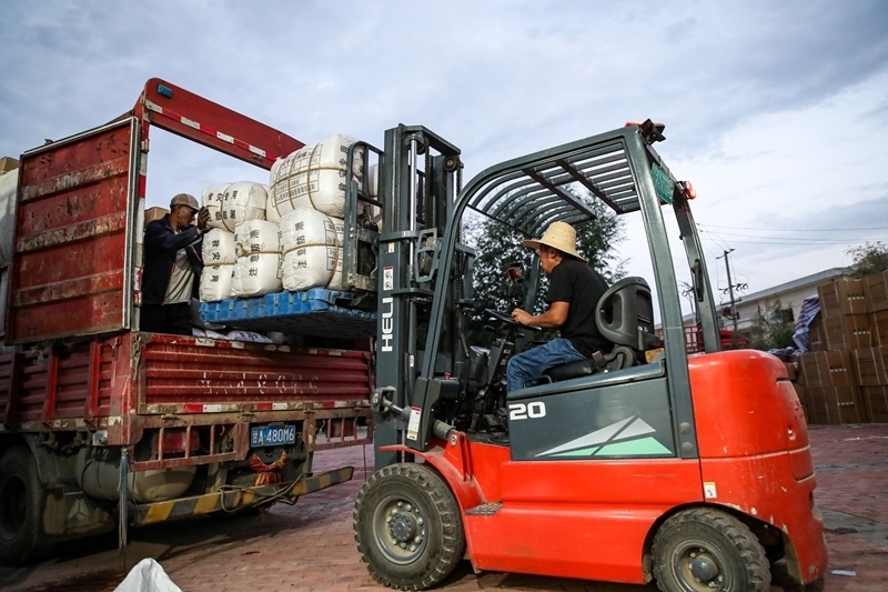8月10日,在榆中縣救災(zāi)物資儲備服務(wù)中心,工作人員將救災(zāi)物資裝車。
