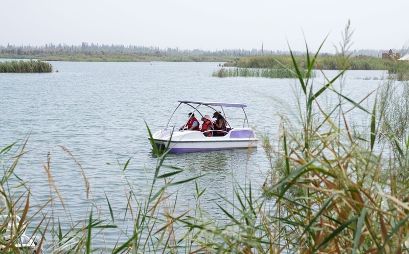 8月6日,人們?cè)诶锢?guó)家濕地公園乘船。