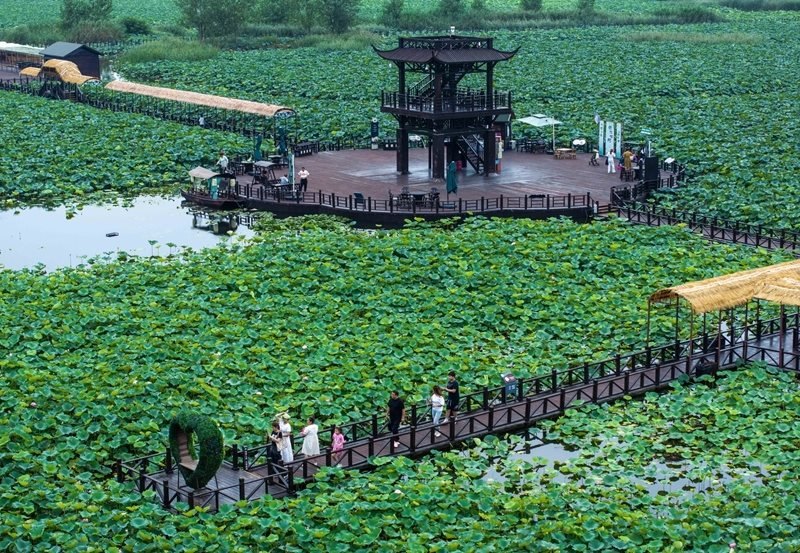 8月13日,游客在江蘇省興化市萬畝荷塘景區(qū)賞荷游玩(無人機照片)。