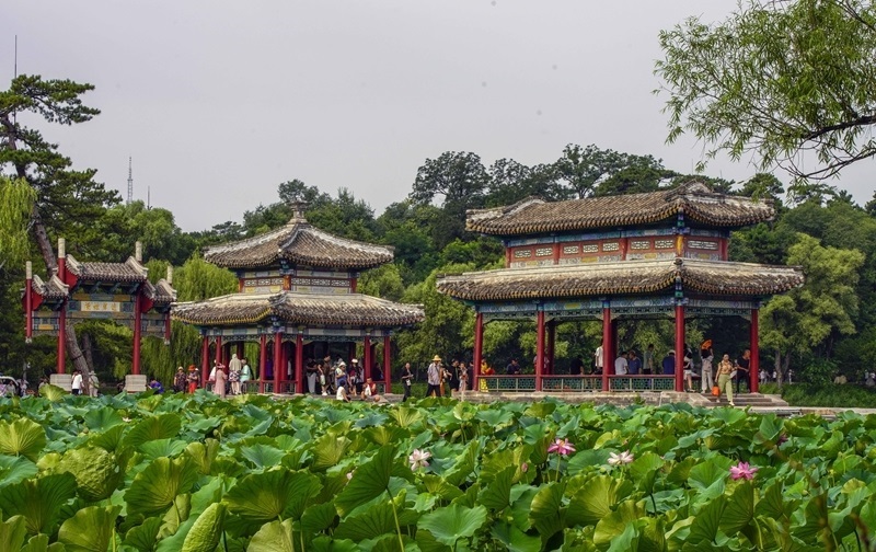 8月12日,游客在河北省承德市避暑山莊景區(qū)游玩觀景。