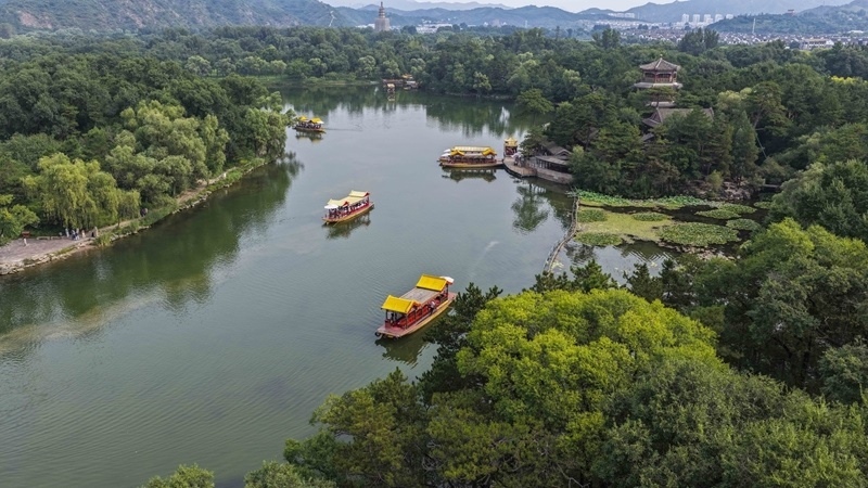 8月12日,游客在河北省承德市避暑山莊景區(qū)游玩觀景(無人機照片)。