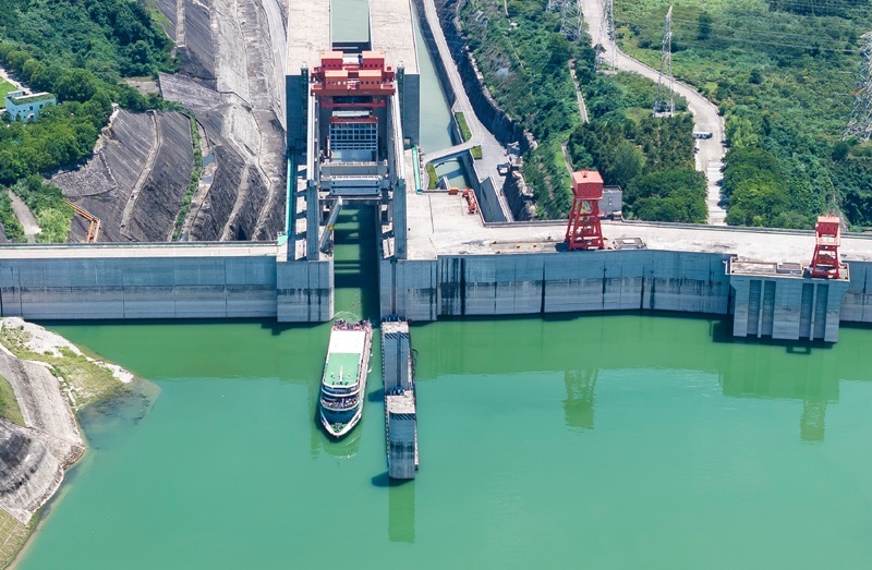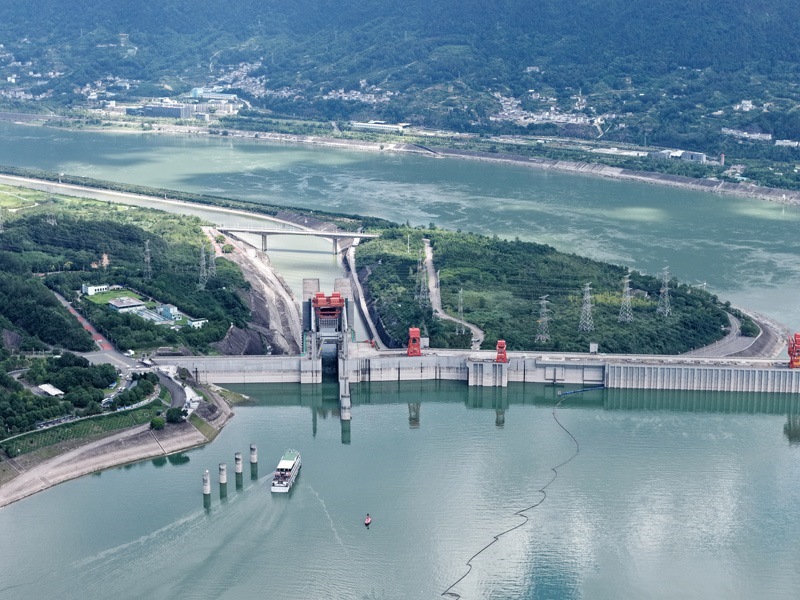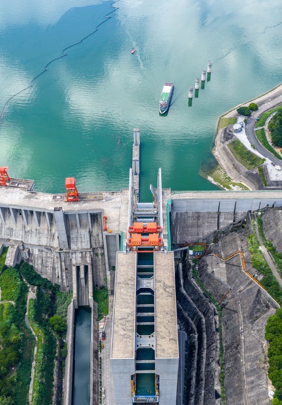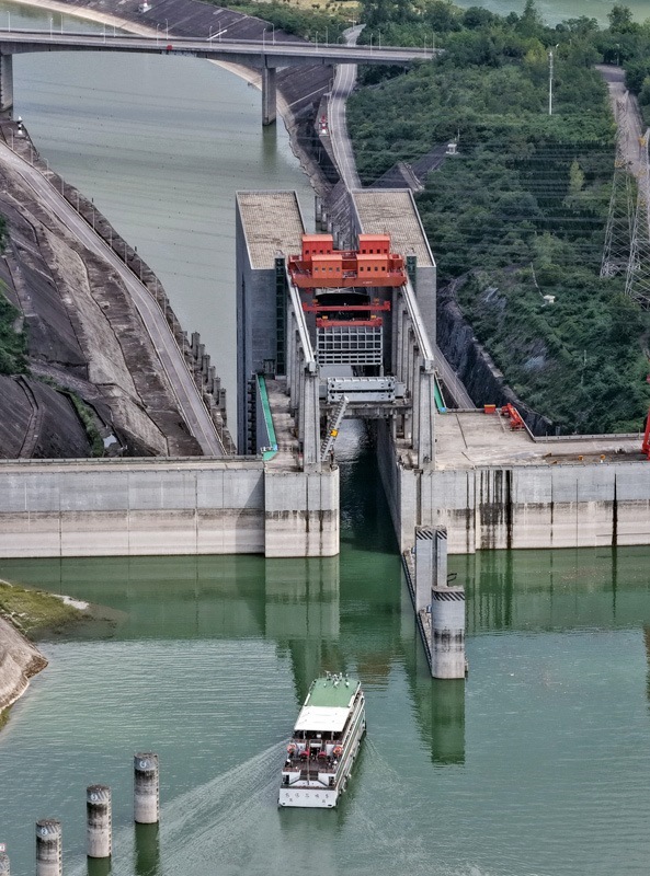8月16日,在湖北省宜昌市,下行游船長(zhǎng)江三峽5號(hào)通過三峽升船機(jī)(無人機(jī)照片)。