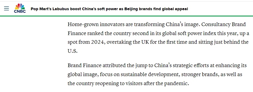 文章說(shuō),英國(guó)“品牌金融”咨詢(xún)公司今年發(fā)布的全球軟實(shí)力指數(shù)顯示,中國(guó)排名升至全球第二——較2024年上升一位,首次超越英國(guó),目前僅次于美國(guó)。該公司分析認(rèn)為,中國(guó)軟實(shí)力躍升的重要原因在于中國(guó)提升國(guó)際形象的戰(zhàn)略性舉措、對(duì)可持續(xù)發(fā)展的堅(jiān)定投入、日益增強(qiáng)的品牌實(shí)力,以及向全球游客敞開(kāi)國(guó)門(mén)。消費(fèi)分析師認(rèn)為,經(jīng)過(guò)這些努力,人們終于能穿透貼在中國(guó)產(chǎn)品身上的負(fù)面濾鏡,看清產(chǎn)品的真正價(jià)值,逐漸擺脫過(guò)去對(duì)“中國(guó)制造”的刻板偏見(jiàn)。