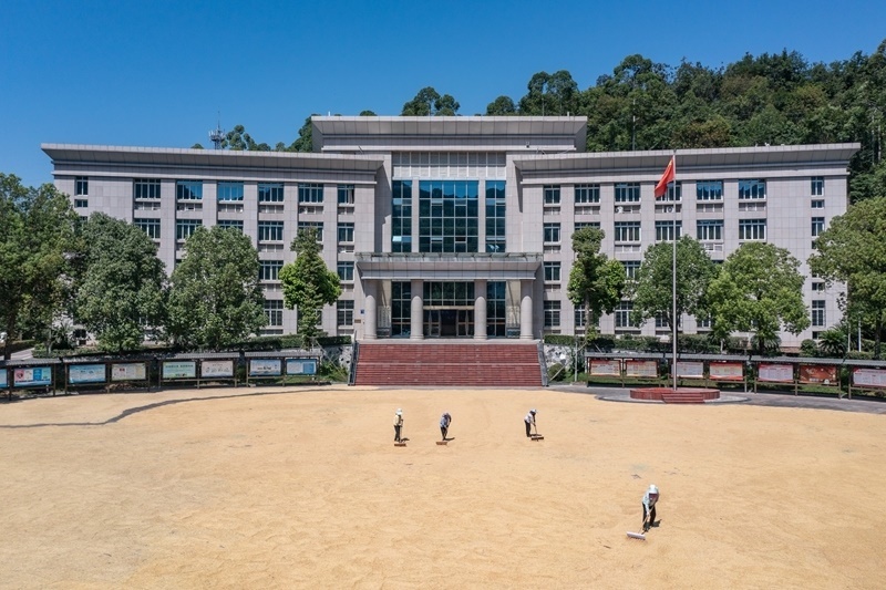 8月20日,人們在重慶市永川區(qū)紅爐鎮(zhèn)政府廣場上晾曬糧食(無人機(jī)照片)。