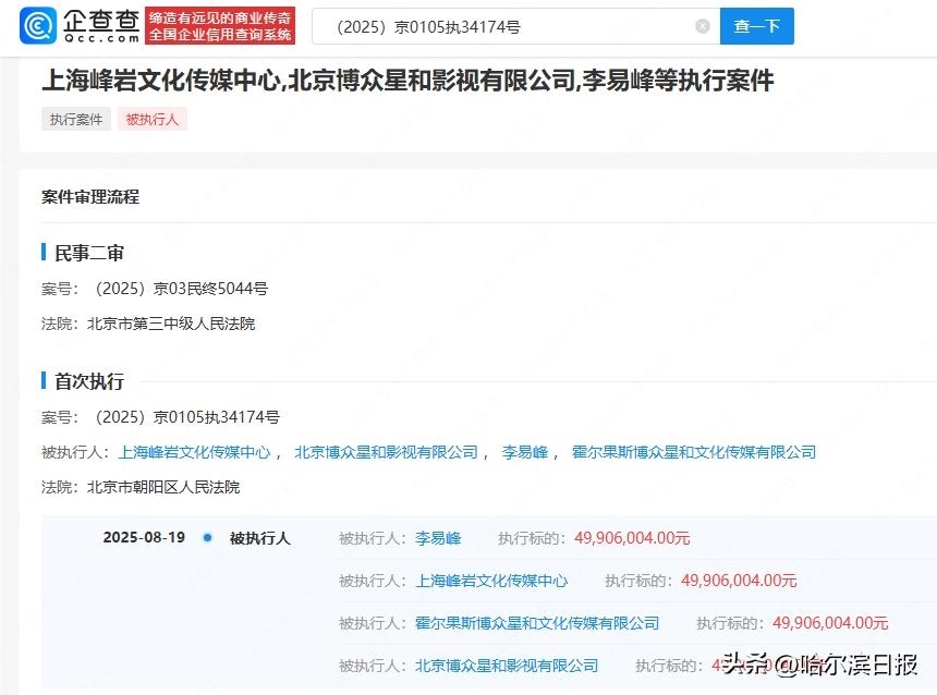 8月21日,記者從企查查獲悉,近日,李易峰、上海峰巖文化傳媒中心、北京博眾星和影視有限公司等被北京市朝陽(yáng)區(qū)人民法院強(qiáng)制執(zhí)行約4990萬(wàn)元。其中,上海峰巖文化傳媒中心成立于2018年,由李易峰個(gè)人出資。