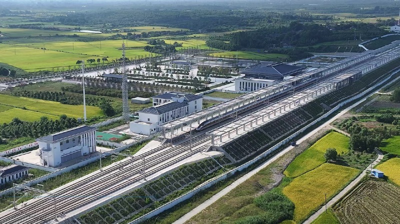 8月23日,試驗列車從荊門市沙洋西站折返,駛向襄陽東站(無人機照片)。