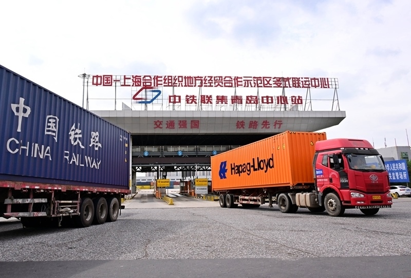 8月27日,貨運(yùn)卡車從位于上合示范區(qū)的中國(guó)-上海合作組織地方經(jīng)貿(mào)合作示范區(qū)多式聯(lián)運(yùn)中心駛出。