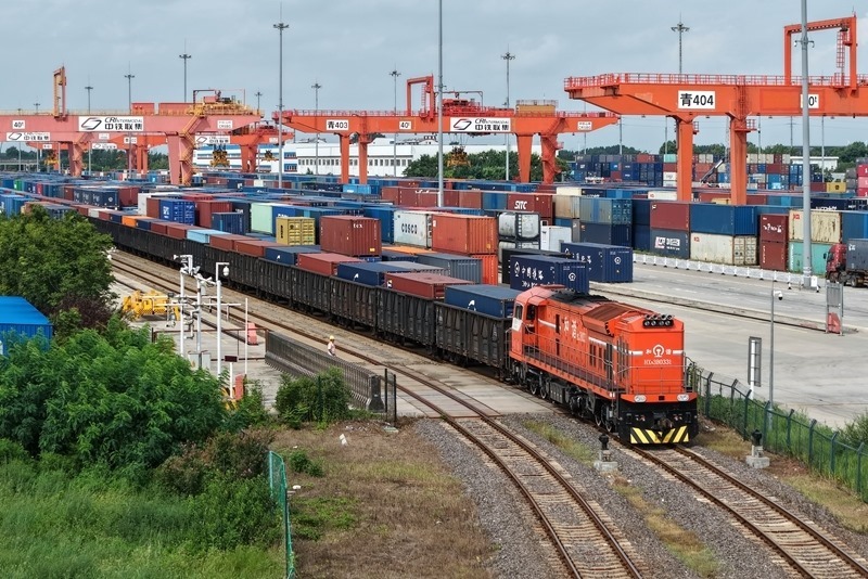 8月27日,一列貨運(yùn)列車駛?cè)胛挥谏虾鲜痉秴^(qū)內(nèi)的中國(guó)-上海合作組織地方經(jīng)貿(mào)合作示范區(qū)多式聯(lián)運(yùn)中心(無(wú)人機(jī)照片)。
