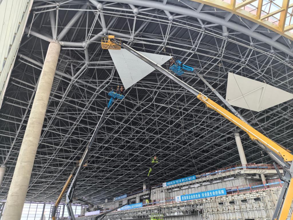 “咔嚓”,隨著兩塊蜂窩金屬鋁板精準扣接,P6施工區(qū)的各吊頂模塊緊緊相扣,為“鳳凰”腹部覆蓋上精美堅固的“銀甲”。