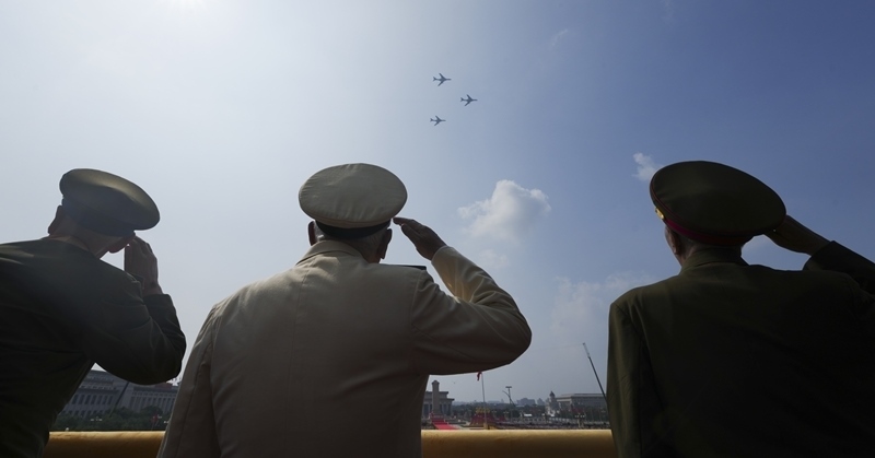 9月3日,紀(jì)念中國人民抗日戰(zhàn)爭暨世界反法西斯戰(zhàn)爭勝利80周年大會在北京隆重舉行。這是轟炸機(jī)梯隊(duì)飛過天安門廣場上空時嘉賓敬禮。