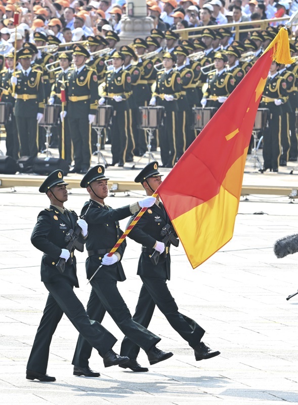 9月3日,紀念中國人民抗日戰(zhàn)爭暨世界反法西斯戰(zhàn)爭勝利80周年大會在北京隆重舉行。這是國旗護衛(wèi)隊在天安門廣場列隊。