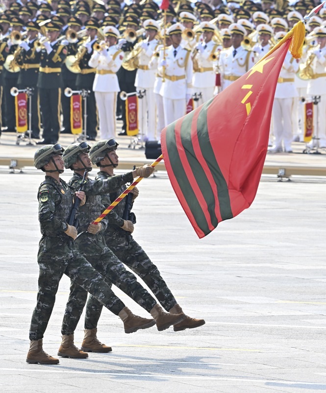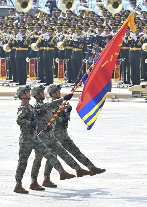 9月3日,紀念中國人民抗日戰(zhàn)爭暨世界反法西斯戰(zhàn)爭勝利80周年大會在北京隆重舉行。這是戰(zhàn)旗方隊接受檢閱。