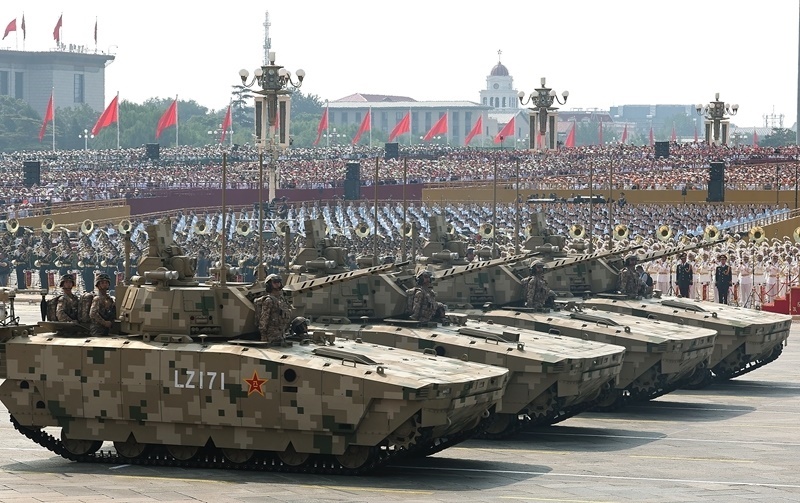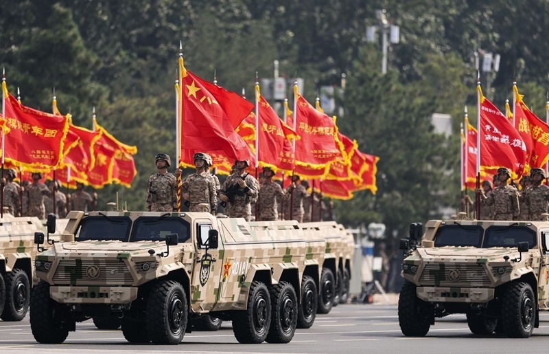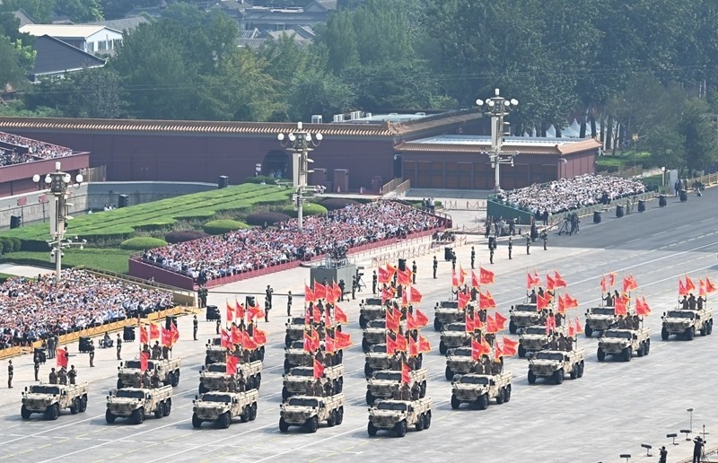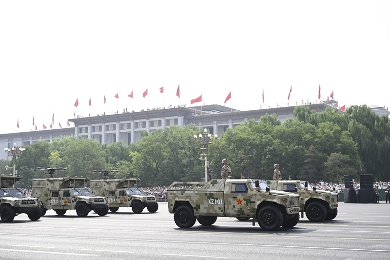9月3日,紀(jì)念中國人民抗日戰(zhàn)爭暨世界反法西斯戰(zhàn)爭勝利80周年大會在北京隆重舉行。這是信息支援方隊接受檢閱。