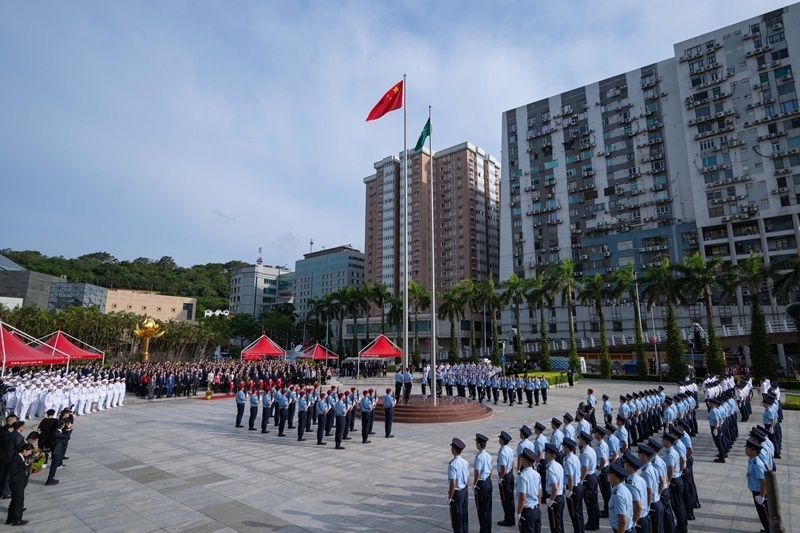10月1日,澳門特別行政區(qū)政府在金蓮花廣場(chǎng)隆重舉行升旗儀式,慶祝中華人民共和國(guó)成立76周年。