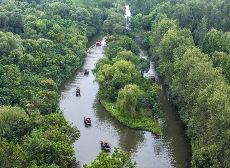 10月1日,游客在江蘇省泰州市姜堰區(qū)溱湖國家濕地公園乘船游玩(無人機照片)。