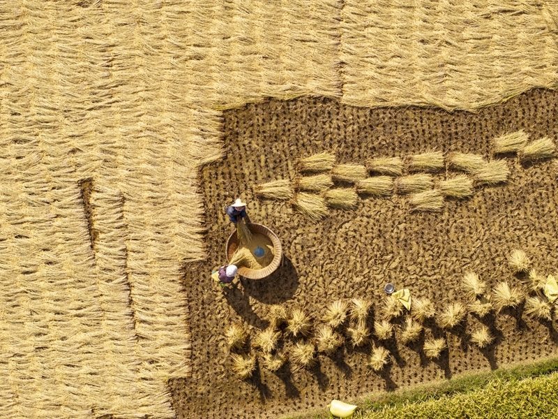 10月3日,農(nóng)民在云南省大理白族自治州洱源縣右所鎮(zhèn)收割水稻(無人機照片)。