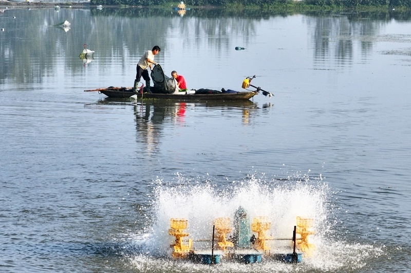 10月4日,蟹農(nóng)在江蘇省寶應縣夏集鎮(zhèn)王營村養(yǎng)殖基地捕撈螃蟹(無人機照片)。