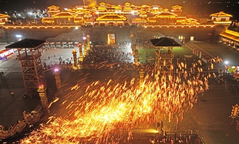 10月3日晚,游客在山東省臨沂市郯城縣郯國(guó)古城景區(qū)觀看打鐵花(無(wú)人機(jī)照片)。