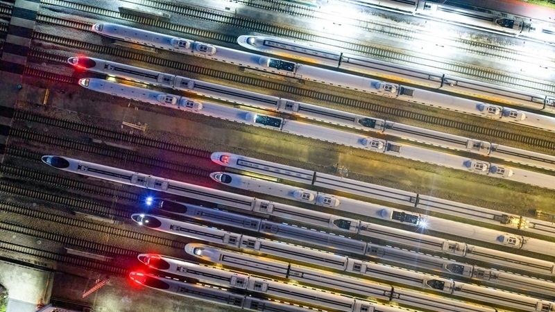 10月10日拍攝的停靠在南京動車段南京南動車運用所存車線上的列車(無人機照片)。