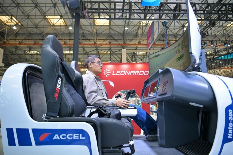 10月14日,工作人員在天津直博會(huì)直升機(jī)館內(nèi)調(diào)試模擬飛行體驗(yàn)設(shè)備。新華社記者 孫凡越 攝