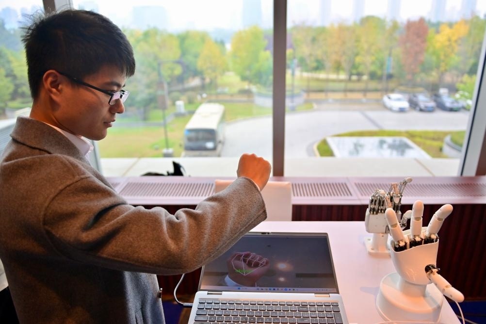 10月17日,在中國(guó)科學(xué)院沈陽自動(dòng)化研究所展臺(tái),工作人員演示“仿生五指靈巧手”展品。新華社記者 吳青昊 攝