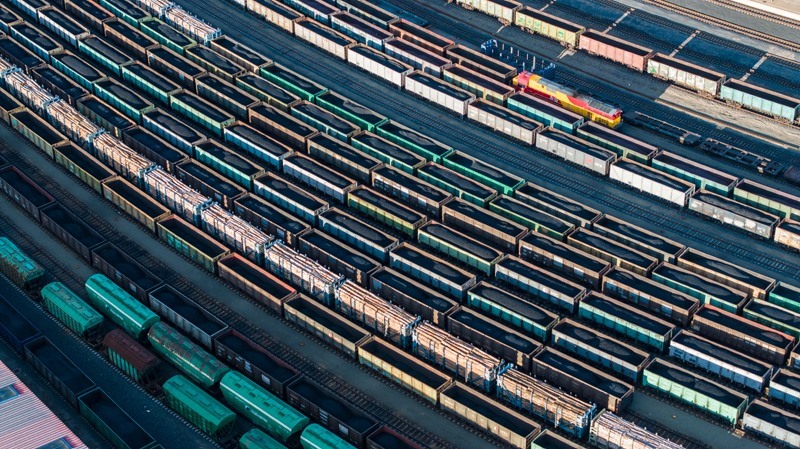 10月18日,在中國鐵路哈爾濱局集團(tuán)有限公司綏芬河站南場,滿載進(jìn)口貨物的列車等待解體換裝(無人機(jī)照片)。