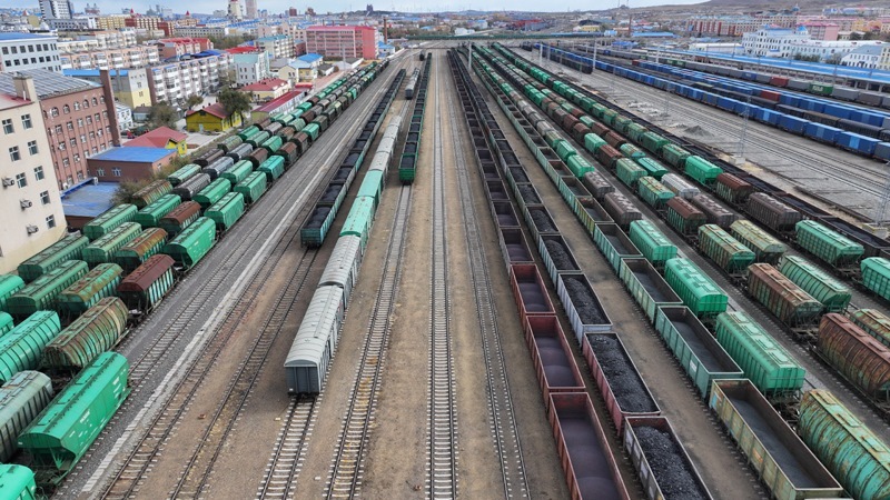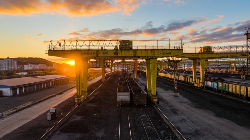 10月18日,在中國鐵路哈爾濱局集團(tuán)有限公司滿洲里站,機(jī)械化換裝場在對進(jìn)口貨物進(jìn)行換裝作業(yè)(無人機(jī)照片)。