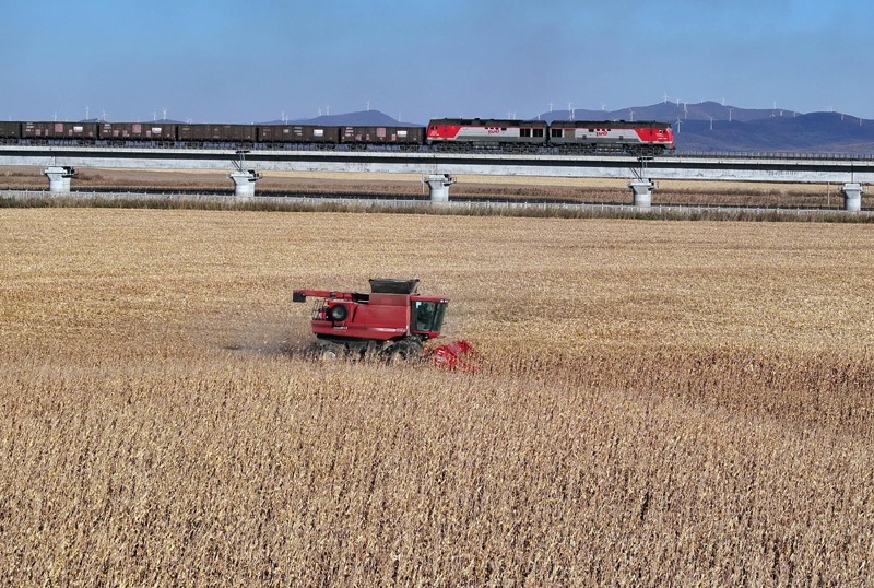 10月16日,滿載進(jìn)口物資的貨物列車駛向中國鐵路哈爾濱局集團(tuán)有限公司同江北站(無人機(jī)照片)。