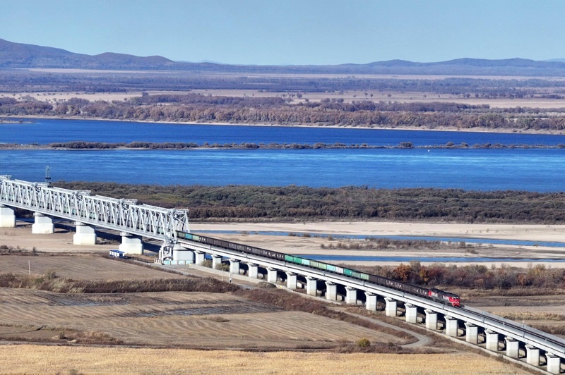 10月16日,滿載進(jìn)口物資的貨物列車通過同江鐵路大橋駛向中國鐵路哈爾濱局集團(tuán)有限公司同江北站(無人機(jī)照片)。