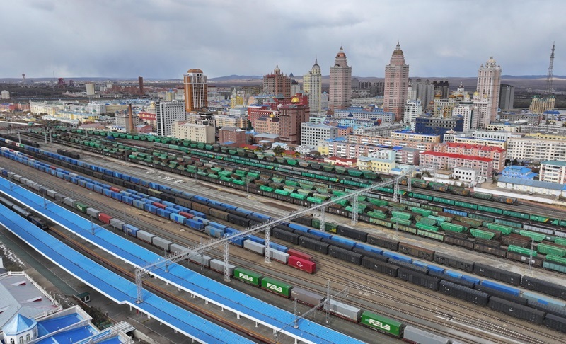 10月18日,一列滿載進(jìn)口物資的貨物列車駛向中國鐵路哈爾濱局集團(tuán)有限公司綏芬河站(無人機(jī)照片)。