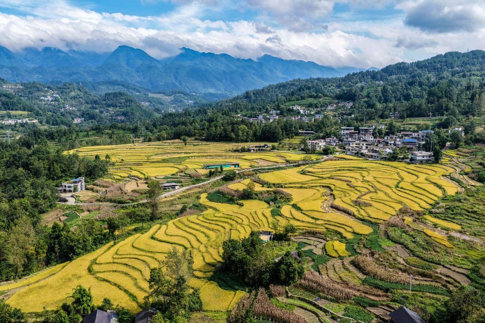 9月18日拍攝的重慶市黔江區(qū)五里鎮(zhèn)梯田景色(無(wú)人機(jī)照片)。地處武陵山區(qū)腹地的重慶市黔江區(qū)五里鎮(zhèn)水稻種植面積5300畝,是武陵山地區(qū)糧食主要產(chǎn)區(qū)之一。新華社記者 唐奕 攝