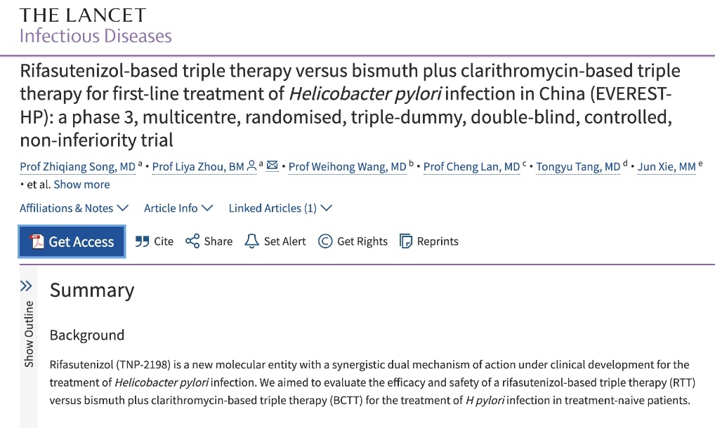 北京大學(xué)第三醫(yī)院消化科周麗雅、宋志強(qiáng)教授團(tuán)隊(duì)帶領(lǐng)全國40家醫(yī)療機(jī)構(gòu)消化疾病診療中心,通過全球首個(gè)Ⅲ期臨床試驗(yàn),證實(shí)了含利福特尼唑的三聯(lián)方案,比臨床上常用的鉍劑四聯(lián)方案具有更高的根除成功率和更低的不良反應(yīng)發(fā)生率,而且用藥更少,服用更方便,將為全球幽門螺桿菌感染者帶來了全新的治療選擇。相關(guān)成果日前于《柳葉刀-感染病學(xué)》在線發(fā)表。