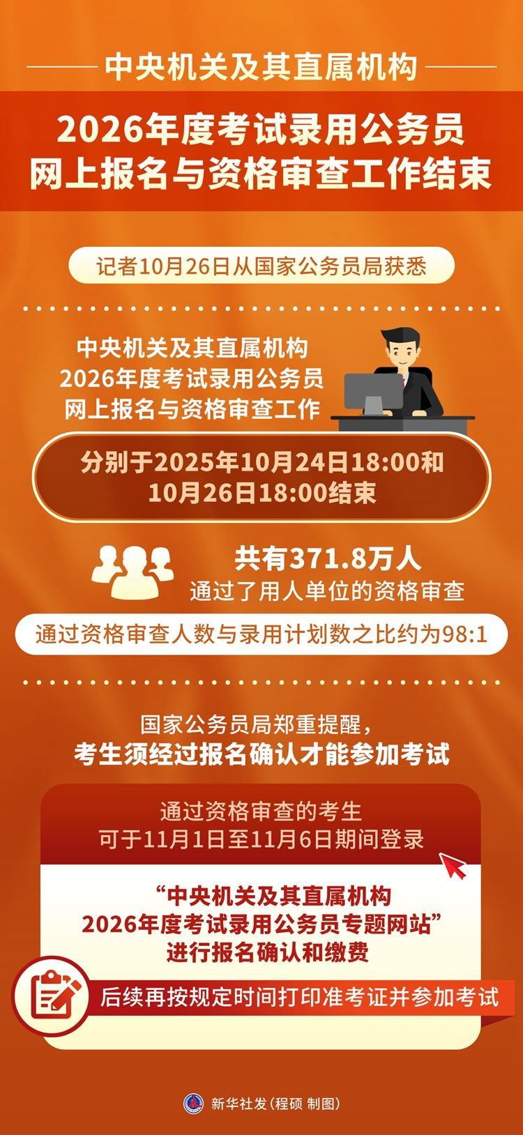 新華社北京10月26日電(記者范思翔)記者26日從國家公務員局獲悉,中央機關及其直屬機構2026年度考試錄用公務員網(wǎng)上報名與資格審查工作分別于2025年10月24日18:00和10月26日18:00結束,共有371.8萬人通過了用人單位的資格審查,通過資格審查人數(shù)與錄用計劃數(shù)之比約為98:1。