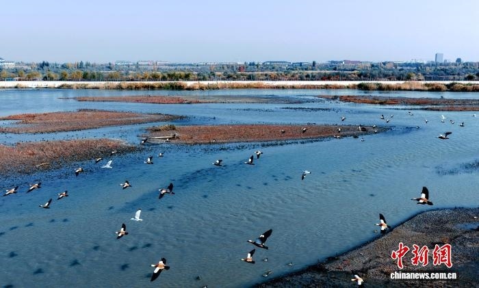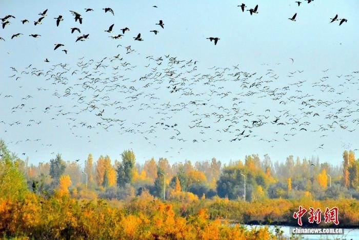 中新網(wǎng)烏魯木齊10月28日電 (黨艷麗)深秋時節(jié),成群結(jié)隊(duì)的灰雁“到訪”新疆可克達(dá)拉市。它們或飛翔在湛藍(lán)的天空上,發(fā)出陣陣鳴叫聲;或集結(jié)在伊犁河可克達(dá)拉市段河畔,補(bǔ)給“能量”,為接下來的遷徙旅程做足準(zhǔn)備。