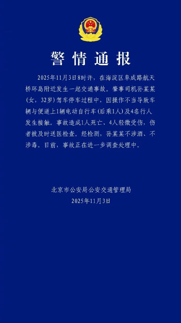 中國網(wǎng)11月3日訊 11月3日,北京交警發(fā)布通報,當(dāng)日8時許,在海淀區(qū)阜成路航天橋環(huán)島附近發(fā)生一起交通事故。肇事司機(jī)孫某某(女,32歲)駕車停車過程中,因操作不當(dāng)導(dǎo)致車輛與便道上1輛電動自行車(后乘1人)及4名行人發(fā)生接觸。事故造成1人死亡、4人輕微受傷,傷者被及時送醫(yī)檢查。經(jīng)檢測,孫某某不涉酒、不涉毒。目前,事故正在進(jìn)一步調(diào)查處理中。