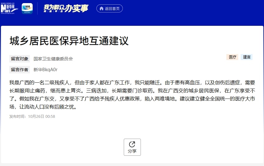 編者按:在醫(yī)療水平整體提升的大背景下,醫(yī)保權益保障等愈發(fā)受到社會各界的關注。近日,有網友在新華網“我為群眾辦實事”網絡平臺反映其在異地就醫(yī)中遇到困惑,《中國醫(yī)療保險》雜志為此邀請江西省醫(yī)保局待遇保障處原處長、原一級調研員蔡海清進行詳細解答。具體內容如下: