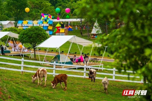 在景區(qū)內(nèi)看到,幾頭黃牛在圍欄內(nèi)悠閑踱步,遠(yuǎn)處白色帳篷點(diǎn)綴草地,彩色氣球懸空,標(biāo)識牌上寫著“草原音樂狂歡節(jié)”。這一幕,成為景區(qū)從“田園牧歌”走向“時(shí)尚秀場”的縮影。
