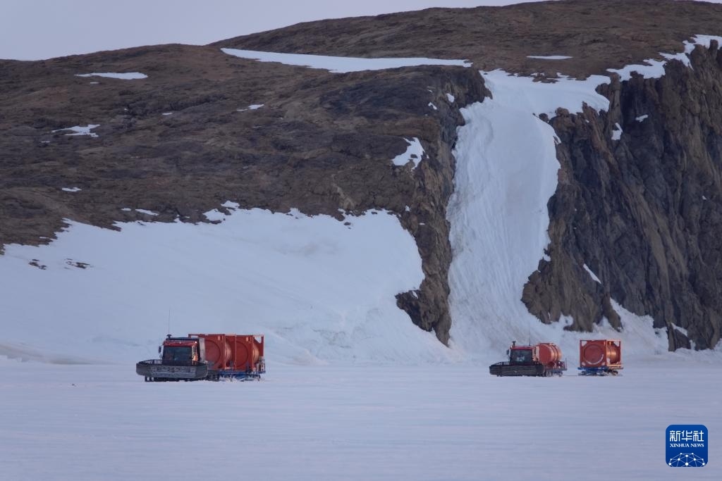 北京時間12月3日凌晨,從中山站和內(nèi)陸出發(fā)基地駛來的雪地車?yán)沼凸薜纸把?”號。新華社記者 顧天成 攝